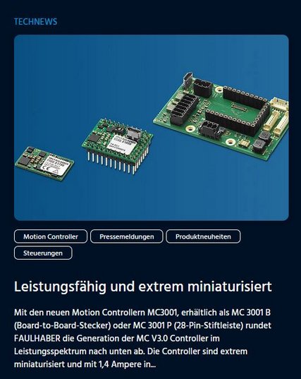 Mit den neuen Motion Controllern MC3001, erhältlich als MC 3001 B (Board-to-Board-Stecker) oder MC 3001 P (28-Pin-Stiftleiste) rundet FAULHABER die Generation der MC V3.0 Controller im Leistungsspektrum nach unten ab. Die Controller sind extrem miniaturisiert und mit 1,4 Ampere in Dauerbetrieb und bis zu 5 Ampere Spitzenstrom sehr leistungsfähig. Konzipiert sind sie als Slaves für Ansteuer- und Positionieraufgaben von DC-Kleinstmotoren, Linearen DC-Servomotoren oder Bürstenlosen DC-Motoren.