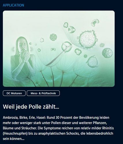 Ambrosia, Birke, Erle, Hasel: Rund 30 Prozent der Bevölkerung leiden mehr oder weniger stark unter Pollen dieser und weiterer Pflanzen, Bäume und Sträucher. Die Symptome reichen von relativ milder Rhinitis (Heuschnupfen) bis zu anaphylaktischen Schocks, die lebensbedrohlich sein können. Umso wichtiger ist es, als Betroffene tagesaktuell zu wissen, wie der Pollenflug vor Ort aussieht. FAULHABER Antriebe sorgen im vollautomatischen Pollenmonitor der Helmut Hund GmbH an verschiedenen Stellen dafür, dass die Pollenzählung zuverlässig und vor allem zeitnah Daten für die Pollenflugvorhersage liefert.