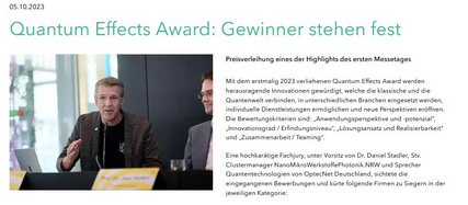 Mit dem erstmalig 2023 verliehenen Quantum Effects Award werden herausragende Innovationen gewürdigt, welche die klassische und die Quantenwelt verbinden, in unterschiedlichen Branchen eingesetzt werden, individuelle Dienstleistungen ermöglichen und neue Perspektiven eröffnen. Die Bewertungskriterien sind: „Anwendungsperspektive und -potenzial“, „Innovationsgrad / Erfindungsniveau“, „Lösungsansatz und Realisierbarkeit“ und „Zusammenarbeit / Teaming“.