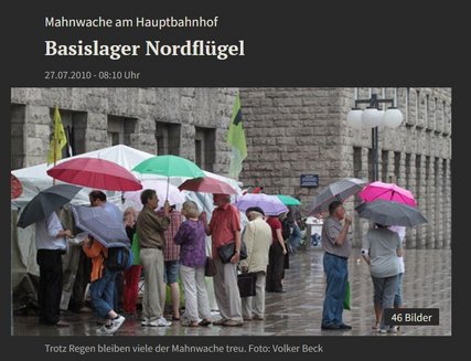 Stuttgart - Seit dem 14. Juli harren die Gegner von Stuttgart 21 am Nordflügel des Stuttgarter Hauptbahnhofs aus. Tag und Nacht, bei Hitze und Regen kann man sie gleich neben dem Nordausgang finden. Ihre Mahnwache haben sie "Basislager Nordflügel" getauft. StZ-Online hat sie einen Tag begleitet. Ein Protokoll.